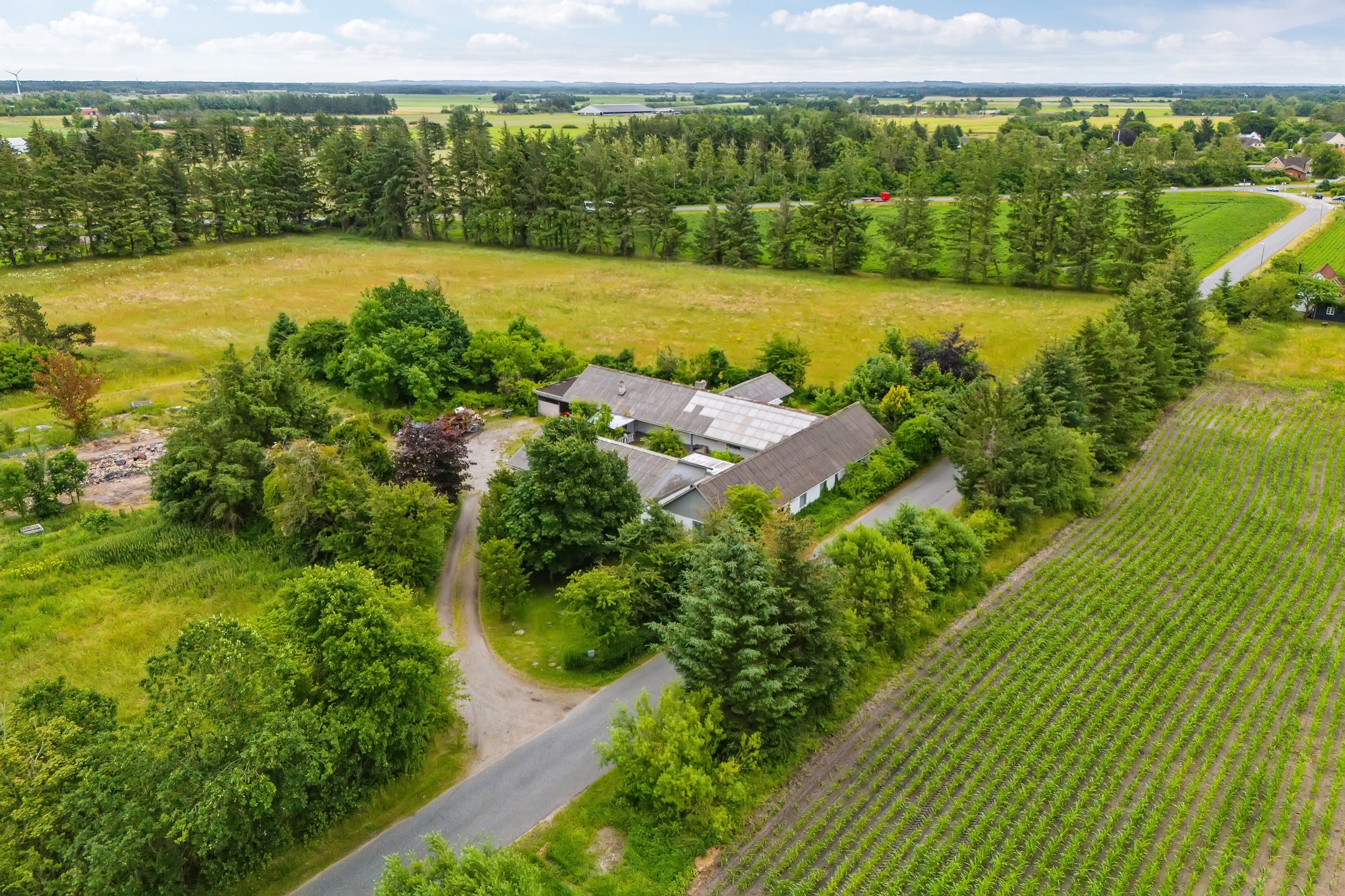 Jorden:Det samlede areal udgør 6,2538 ha, heraf er ca. 6 ha bortforpagtet til og med 31.12.2024. 2,6 ha er i drift, resten er udlagt som græs. Alle arealer er omkranset af læbælter, og beliggende omkring bygningerne.